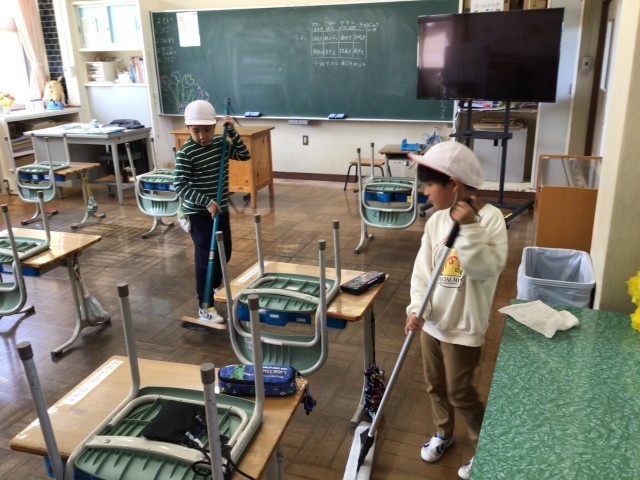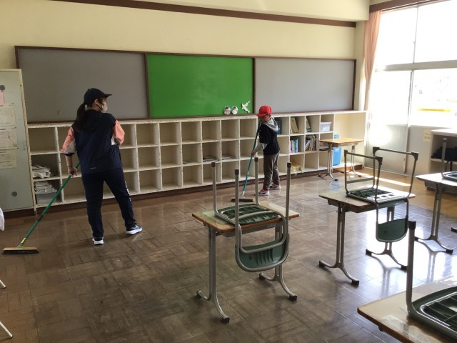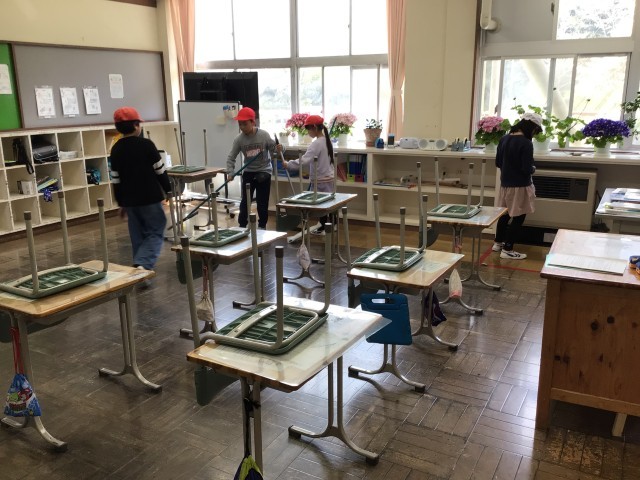 今日は気温がぐんぐん上がり、初夏を思わせるような陽気でした。子どもたちは校庭に出て、思い思いに体を動かしていました。月曜日は掃除の日です。少ない人数で協力して教室などをきれいにしていました。
