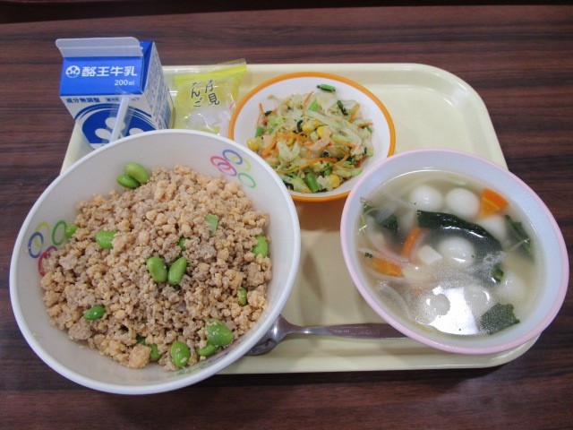 今日の給食は十五夜献立です。メニューは、そぼろごはん、牛乳、キャベツと小松菜のおひたし、お月見スープ、お月見だんごです。