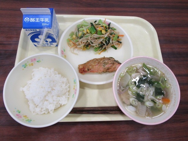 今日の給食は、食育の日献立です。メニューは、ごはん、牛乳、鮭の三味焼き、小松菜のからしあえ、豚汁です。