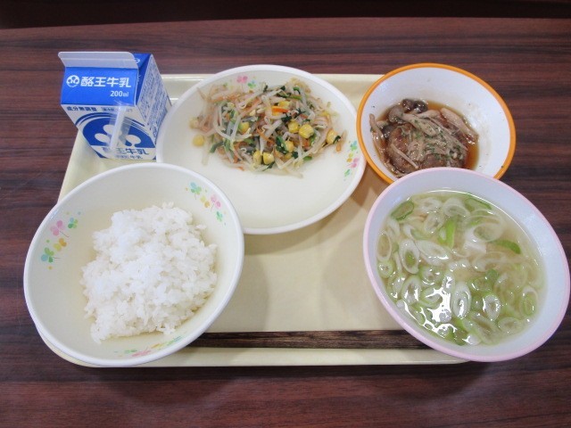 今日の給食の献立は、ごはん、牛乳、ハンバーグきのこソースがけ、三色おひたし、じゃが芋と豆腐のみそ汁です。