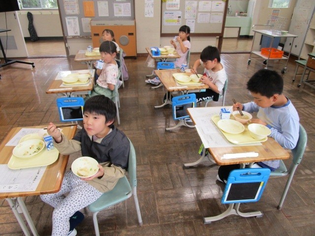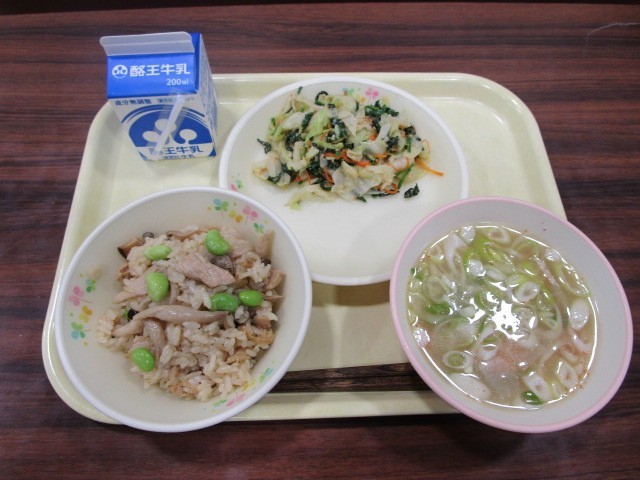 今日の給食の献立は、きのこごはん、ほうれんそうとキャベツのごまあえ、けんちん汁です。