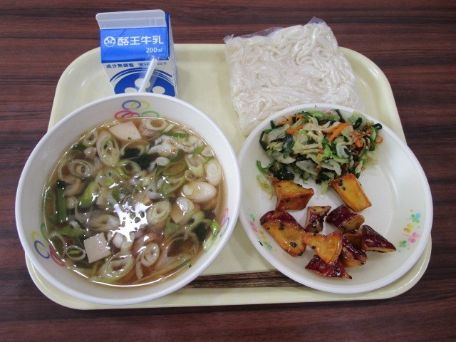 今日の給食の献立は、五目うどん、牛乳、大学芋、おかか入りおひたしです。