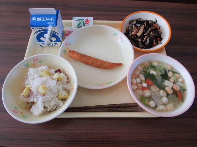 メニューは、さつま芋ごはん、牛乳、ししゃもフライ、ひじきの炒め煮、ネギのみそ汁です。