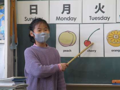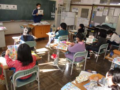 2月5日 3・4年生の外国語活動。数や曜日、果物の言い方を復習していました。黒板の前でカードを指差しながら、