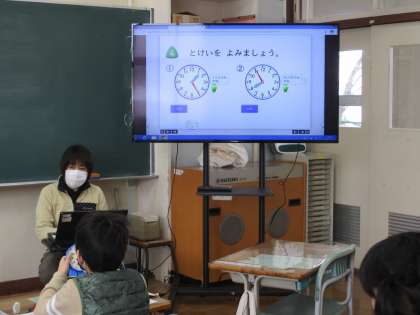 2月9日 1年生が時計の学習をしていました。短針が表す何時と長針が表す何分。同じ文字盤でも読み方が変わるのが、時計の読み方の難しいところ。こんな時にもデジタル教科書が大活躍。各学級に導入した大型テレビを効果的に活用しながら、子ども達の学習理解を深めていきます。
