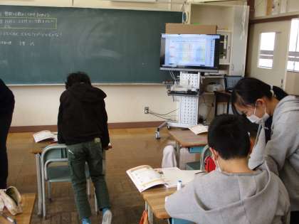 4月9日 5年生が算数科の学習中。デジタル教科書を活用しながら、かつ、互いに学び合う時間もしっかりと確保していきます。