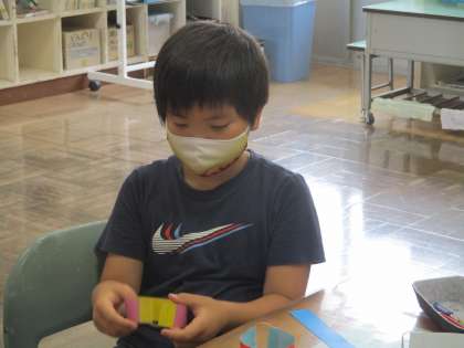 7月5日 2年生がたくさんの「わっか」を作っていました。腕や足、腰に巻き付けています。どうやら、紙で作った「わっか」を体に付けて、何かに変身する工作の学習のようです。