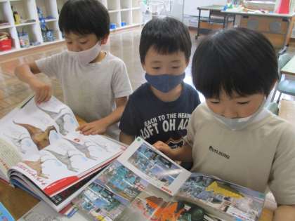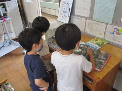 7月5日 休み時間になると、真っ先に校庭に飛び出す1年生なのですが、今日はあいにくの雨。教室で過ごすようになります。こんな時はやっぱり読書。1年生は、みんな車や恐竜の本が好きなようです。