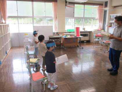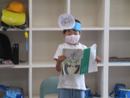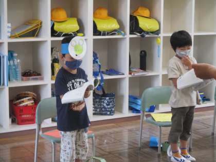 7月5日 「大きなかぶ」の音読をがんばる1年生。今度、みんなの前で発表をする計画を立てているようです。1年生は3人とも声がよく通るので、発表の日が楽しみです。