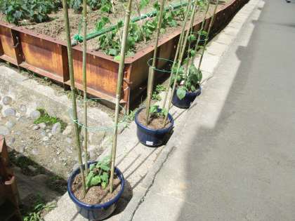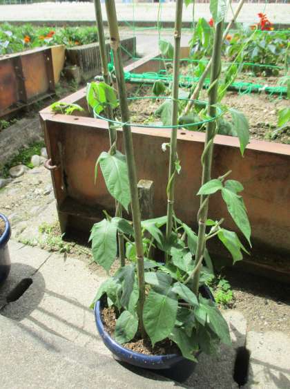 7月6日 アサガオの植え替えも無事に終わり、支柱が立ちました。支柱は、用務員さんの手作りです。アサガオは無事支柱に絡みついていきました。これから、暑くなるとたくさんの花を咲かせます。1年生のみなさん、大切にお世話をしてくださいね。
