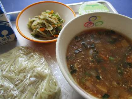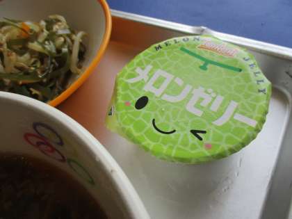7月6日 今日の給食のメニューは、「ジャージャー麺」「すき昆布の香味和え」、そして「メロンゼリー」です。