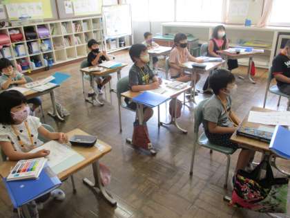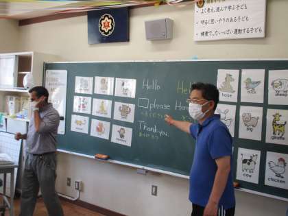 7月6日 今日はAETの先生が来校する日でした。1・2年生は、英語表現科が大好き。楽しみに待っていました。