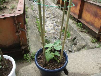 支柱に巻き付き始めたアサガオ。これからどんどん成長しそうです。