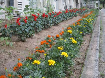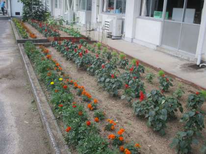 7月7日 先日、子ども達が植え替えをした学校花壇ですが、マリーゴールドもサルビアもすっかり根付き、きれいな花を咲かせています。