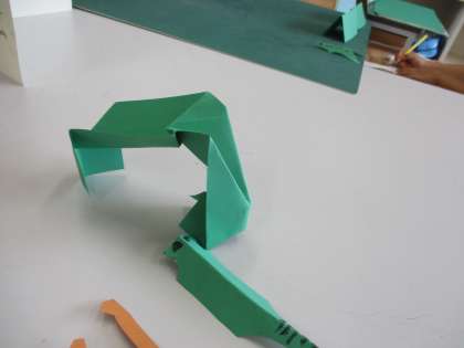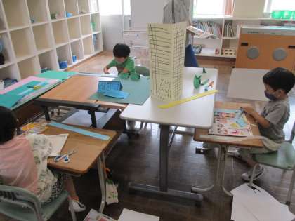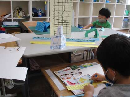 7月8日 画用紙を折って、いろいろなものを立ち上がらせる1年生。どんどん町になってきました。「1年生タウン」です。一番大きい建物は、どうやらホテルのようです。学校や車も作っていました。