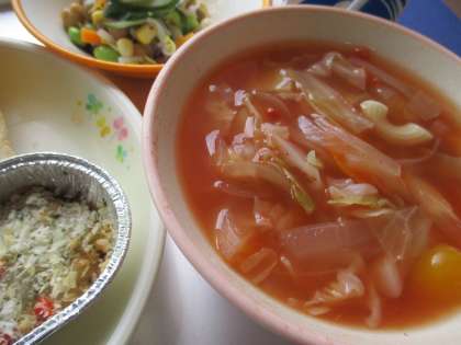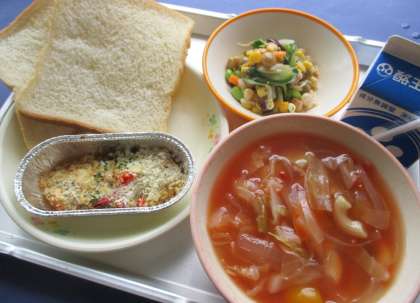 7月8日 今日の給食のメニューは、「夏野菜のミネストローネ」「アジのチーズパン粉焼き」「豆サラダ」でした。