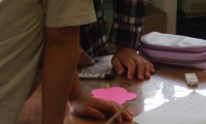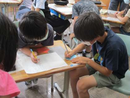そこで、今回、代表委員会で話合いが行われ、「スローガンの木」をつくることになりました。「あいさつ」「協力」「笑顔」どの花が、どのように咲いたかを書いて、昇降口の掲示板を彩るようです。2・4年生がさっそく活動していました。