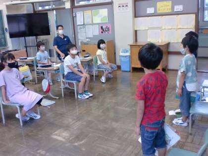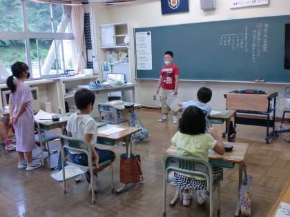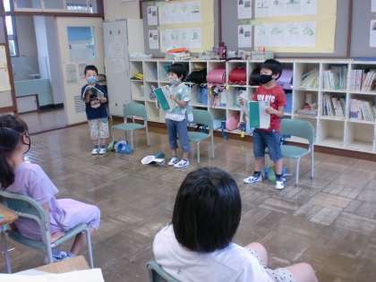 7月9日 1校時目。1年生と2年生が、お互いに国語科の学習を発表し合いました。