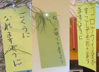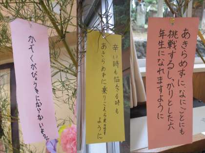 7月9日 子ども達が帰った後、改めて、笹飾りを見て見ると。そこには、いろいろな願いがありました。高学年らしい自覚と決意にあふれたもの、家族やペットを思ったもの、子どもらしさにあふれたもの。