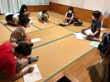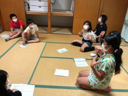 7月12日 今日の本当の最後の活動は、班長会議です。班長さん達が、進んで意見や疑問を出し合い、今日の振り返りと明日の確認を行っていました。