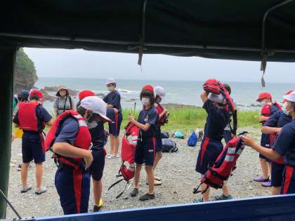 7月13日 磯遊びをする海岸に到着です。ライフジャケットをしっかり装着して、海辺の生き物探しやきれいな貝殻、シーグラス探しなどをします。子ども達のワクワク感が伝わってきました。