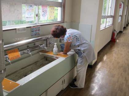7月14日 スクールサポートスタッフの先生は、毎日、学校の拭き掃除をしてくださいます。これがいつもの光景になっていますが、「当たり前」ではなく「ありがたい」ことなのだということを忘れずに、子ども達と共に感謝の気持ちを大切にして過ごしていきます。