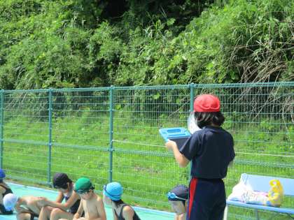 7月14日 明日の校内水泳記録会にむけて、4〜6年生が最後の練習に励んでいました。見学している子も動画撮影で協力し、一丸となってがんばっています。