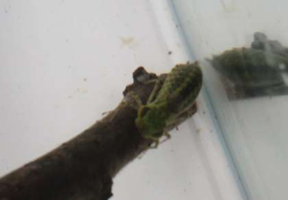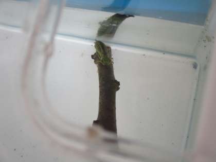 生活科の学習で、12日に県農業総合センターに虫取りに行った時に、手に入れたようです。お手入れがしっかりされた、きれいな水槽に木の枝が差し込まれ、その枝にしっかりとしがみつくヤゴがいました。