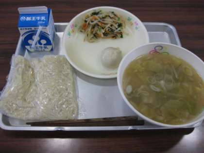 今日の給食はタンメン、牛乳、えびニラまんじゅう、もやしのナムルでした。とてもおいしかったです。