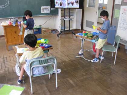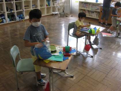 色画用紙やすずらんテープを使って、「わっかでへんしん」に取り組みました。