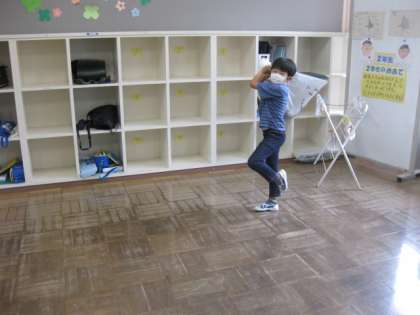 今日は雨のため、教室で過ごしました。ロッカーに点数を決め、まるめた新聞紙が入ったら得点とし、合計を競いました。