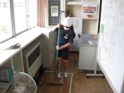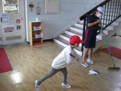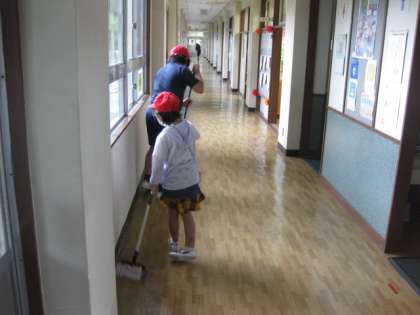 月曜日と木曜日は縦割り清掃を行っています。5・6年生が1年生に清掃のやり方をていねいに教えています。