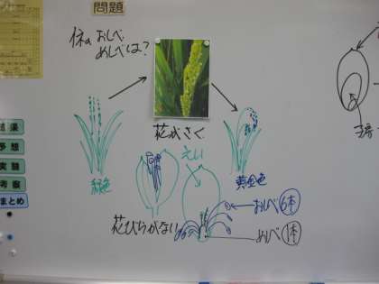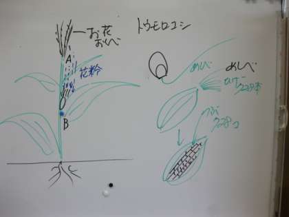 トウモロコシも雄花と雌花があります。トウモロコシの雌花は葉の根元にあり、トウモロコシの食べられる実の部分は、葉の根元にできること等を学習しました。