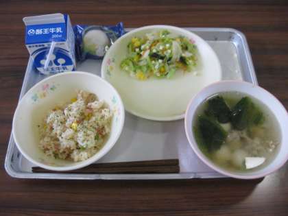 今日の給食は十五夜献立です。コーンピラフ、牛乳、キャベツサラダ(フレンチ味)、お月見スープ、お月見団子です。大変おいしい給食でした。