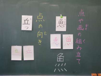 点や画の組み立て、点の向きについて学習しました。間違いをしっかり指摘することができました。
