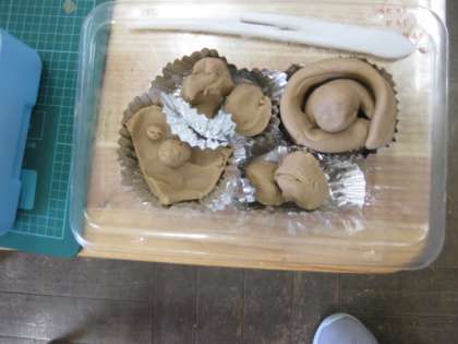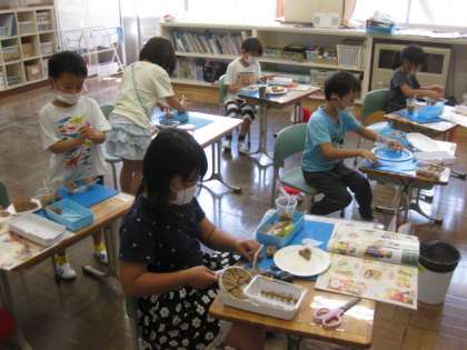 粘土でチーズの空き箱等を利用して、食べ物をつくりました。とても楽しそうでした。