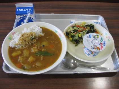 今日の給食は、ポークカレーライス、牛乳、海藻とゆで野菜のサラダ、ヨーグルトです。カレーライスとサラダのどちらも大変おいしかったです。