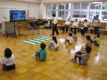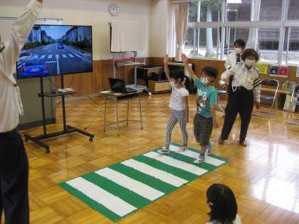 1・2年生は歩行について、交通安全教室を行いました。動画を見た後、歩行の際の注意点を講師の先生に教えていただきました。また、手を挙げて、横断歩道を歩く練習をしました。