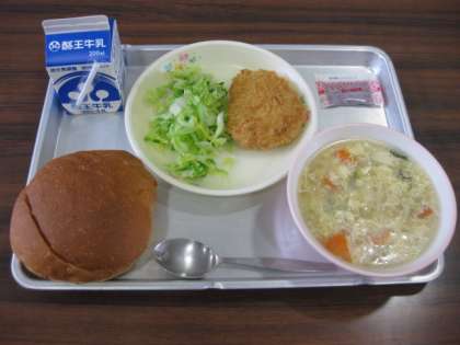 今日の給食は、バンズパン、牛乳、チキンカツ、パックソース、ボイルキャベツ、洋風かき玉スープです。バンズパンに、ソースをかけたチキンカツとキャベツをはさんで、いただきました。今日も大変おいしかったです。