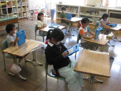 昨日の生活科で、2年生と一緒に校庭の昆虫を捕まえました。今日は、タブレット端末を使用して、昆虫写真を撮影したり調べたりします。