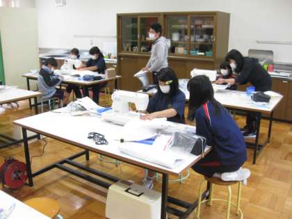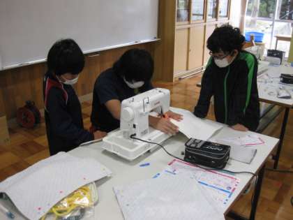 陸上交歓会で持参するナップザックを作っています。ミシン操作もとても上達しました。