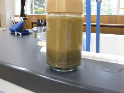 流れる水のはたらきによって地層がつくられることを実験で確かめました。(コーヒーの容器に入っているのは校庭の土です。見事に3つの層に分かれています。)