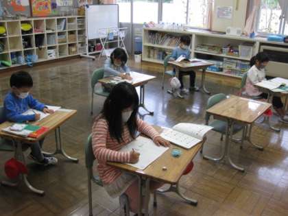 プリントでカタカナ等の復習をしています。なぞり書き等を行い、丁寧に取り組みました。
