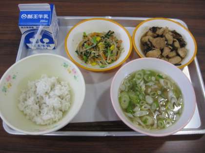 今日の給食は、麦ご飯、ささみのきのこソース、小松菜のおひたし、ねぎのみそ汁です。ささみのきのこソースが大変おいしかったです。ねぎのみそ汁は、ねぎとだしの風味がよく出ていました。小松菜のおひたしも良い味付けでした。大変おいしくいただきました。
