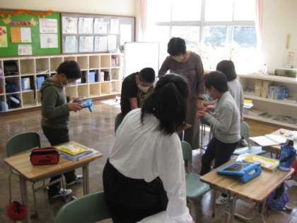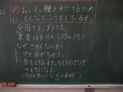 郡山市は、鯉の生産量が全国市町村別第1位の生産地です。「おいしい鯉を育てるためにどんな工夫をしているか」を課題にして、端末を使って調べています。