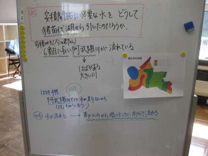 「安積開拓に必要な水を、どうして猪苗代湖から引いたのだろうか」を課題にして学習に取り組みました。郡山市周辺の高さの違いに着目し、モデルを作成して考えました。