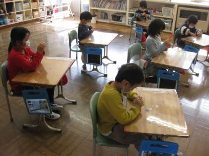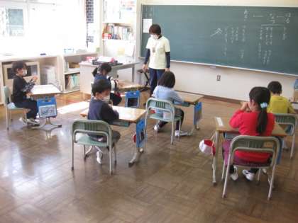 学校の花壇に植えたワタに花が咲き、果実が割れて白いワタができました。ワタを手にとって観察しています。