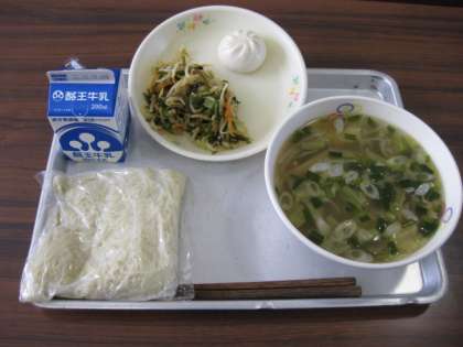 今日の給食は、タンメン、牛乳、ミニ肉まん、すき昆布の香味あえです。今日も大変おいしかったです。
