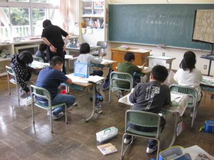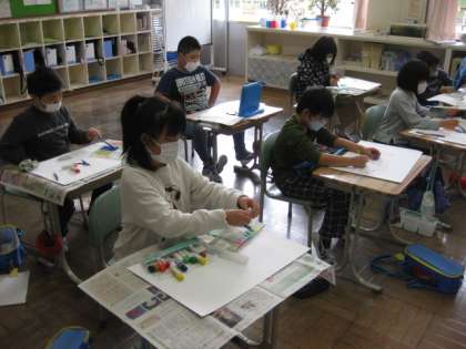 「あの日、あのとき」をテーマに、画用紙に下描きをした後、絵の具で色を塗りました。