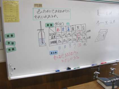 「色のちがいで、あたたかさにちがいがあるか」を課題にして、学習に取り組みました。ノートをていねいにまとめています。